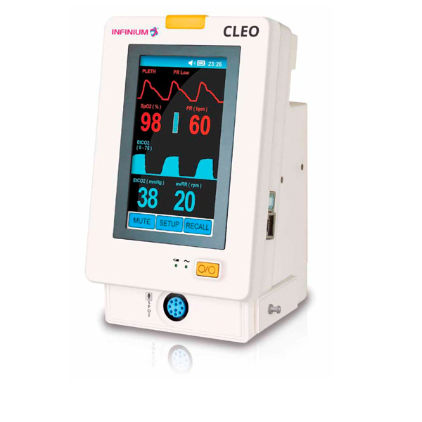 Máy đo nồng độ bão hòa hòa oxy SpO2 để bàn Cleo là một cách tiếp cận mới và trực quan để đo lường các dấu hiệu quan trọng của bệnh nhân. Máy Cleo có thể được tạo ra để đo bất kỳ sự kết hợp nào của: huyết áp không xâm lấn, SpO2, nhiệt độ nhanh chóng, và EtCO2.